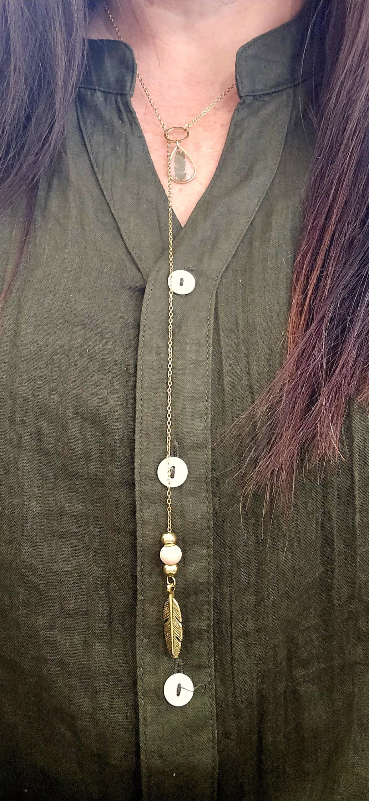 It’s designed as a lariat — simply thread the feather pendant through the loop and it sits perfectly every time.